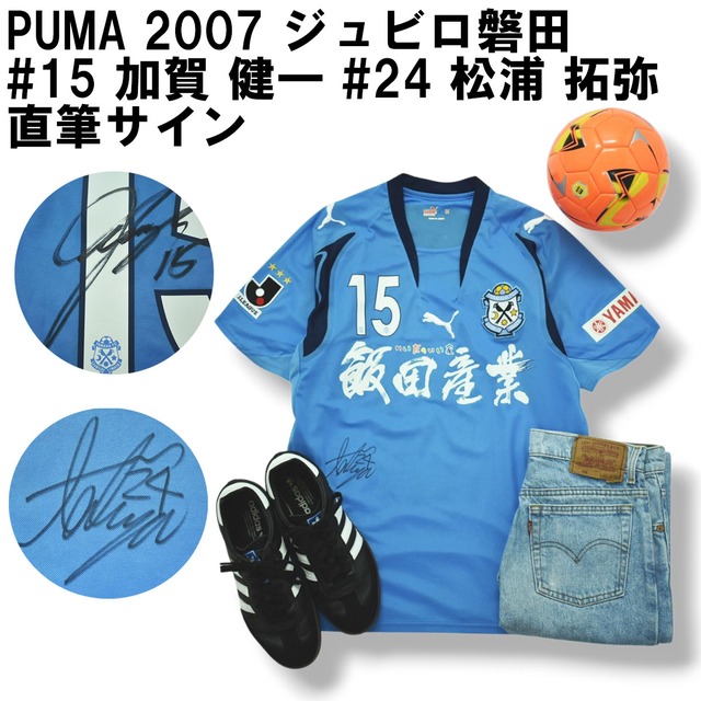 日本製 プーマ PUMA 2007 ジュビロ磐田 HOME 1st S/S #15 加賀 健一 #24 松浦 拓弥 直筆 サイン入り ユニフォーム M ライトブルー ゲーム シャツ サッカー フットボール ウェア メンズ