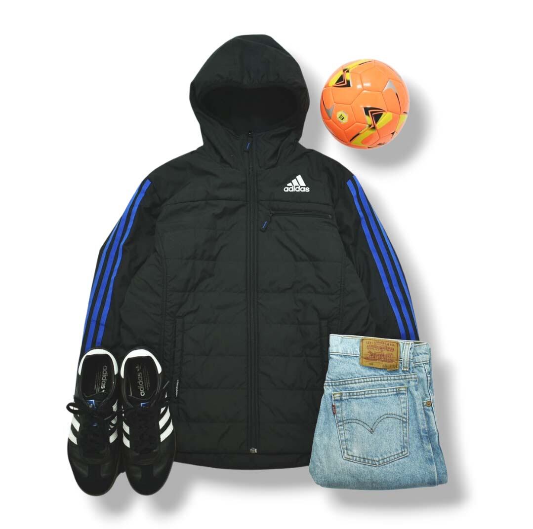 定番のパフォーマンスロゴとスリーストライプス入りのキルティングジャケット。
