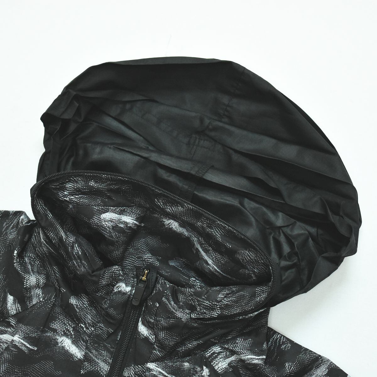 ブラックを基調にした迷彩柄デザインのウィンドジャケット。