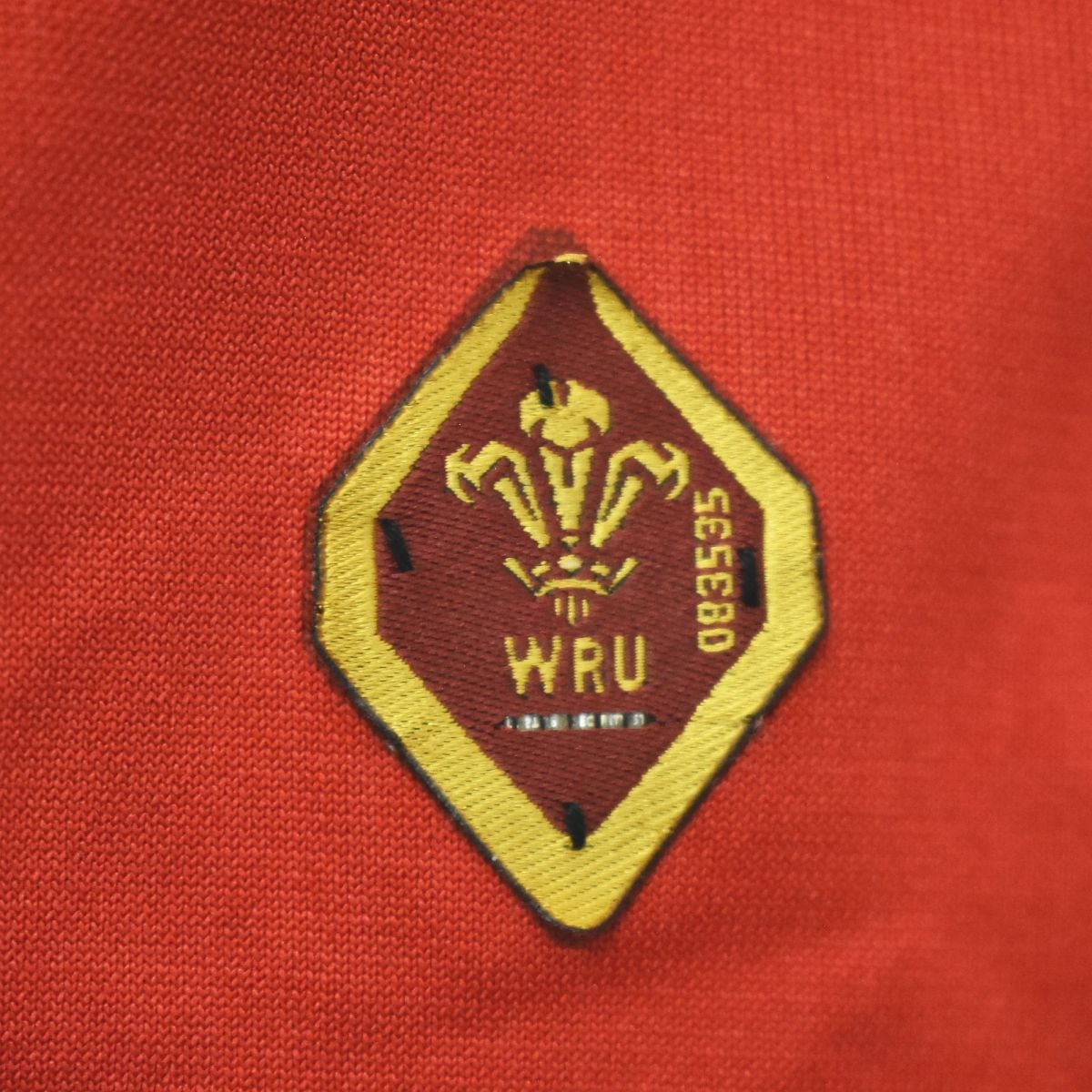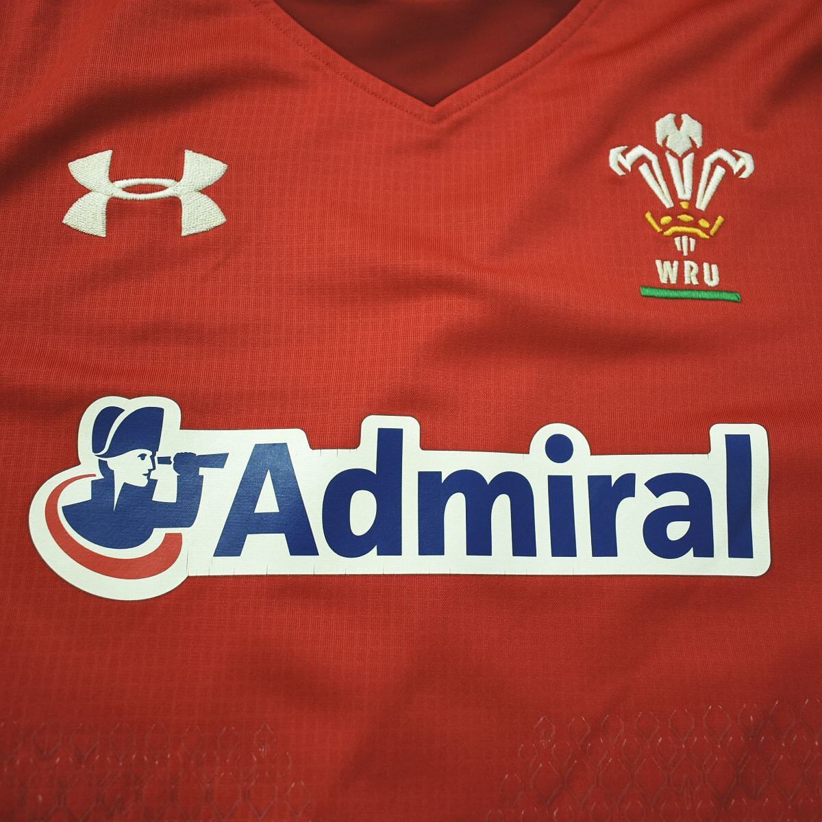 胸元にはウェールズラグビー協会(WRU)のエンブレム、右胸にはブランドロゴ、中央にはスポンサー「Admiral」プリントが施された公式デザインです。
