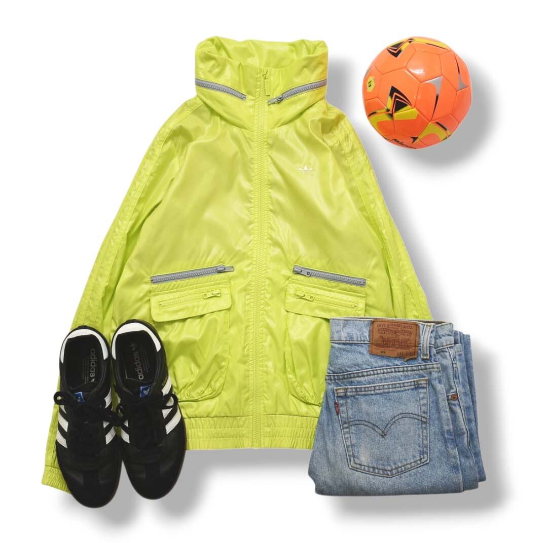 こちらは存在感抜群のネオンイエローが目を惹くウィンドジャケット。スリーストライプスとトレフォイルロゴをあしらった、ブランドらしさ溢れるジャケットです。