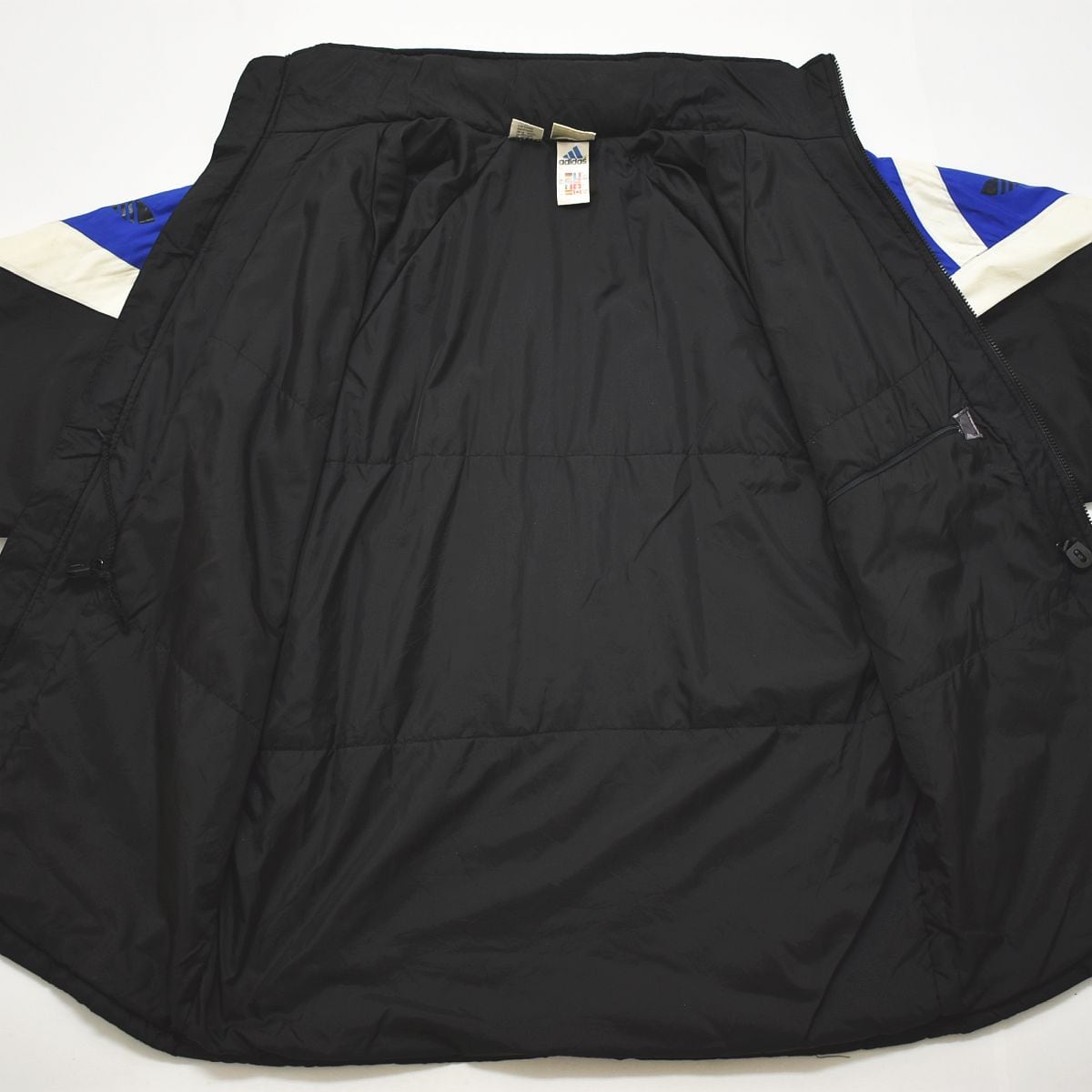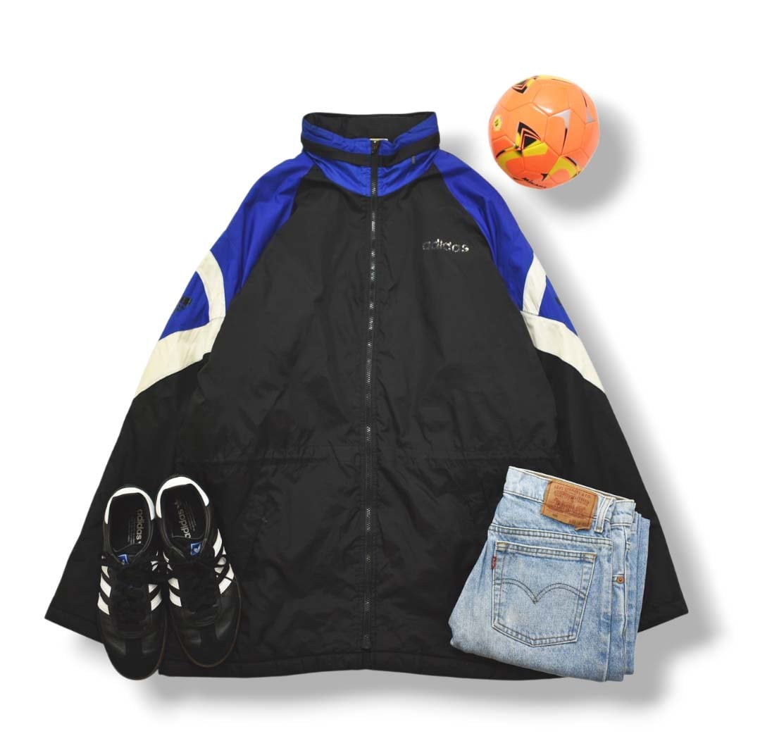 90s ヴィンテージ アディダス adidas ナイロン ジャケット ラグランスリーブ スリーストライプス トレフォイル ロゴ 中綿 US L ブラックxブルー スポーツ ストリート メンズ