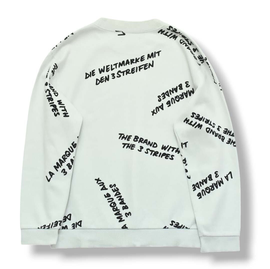 胸にはトレフォイルロゴ、全体に総柄調の文字がプリントされたスウェットです。