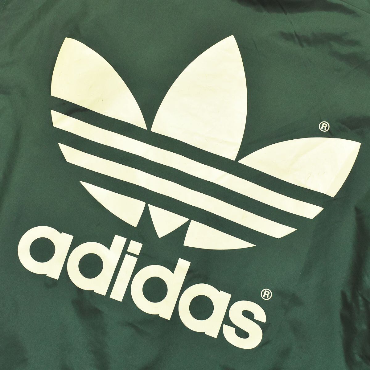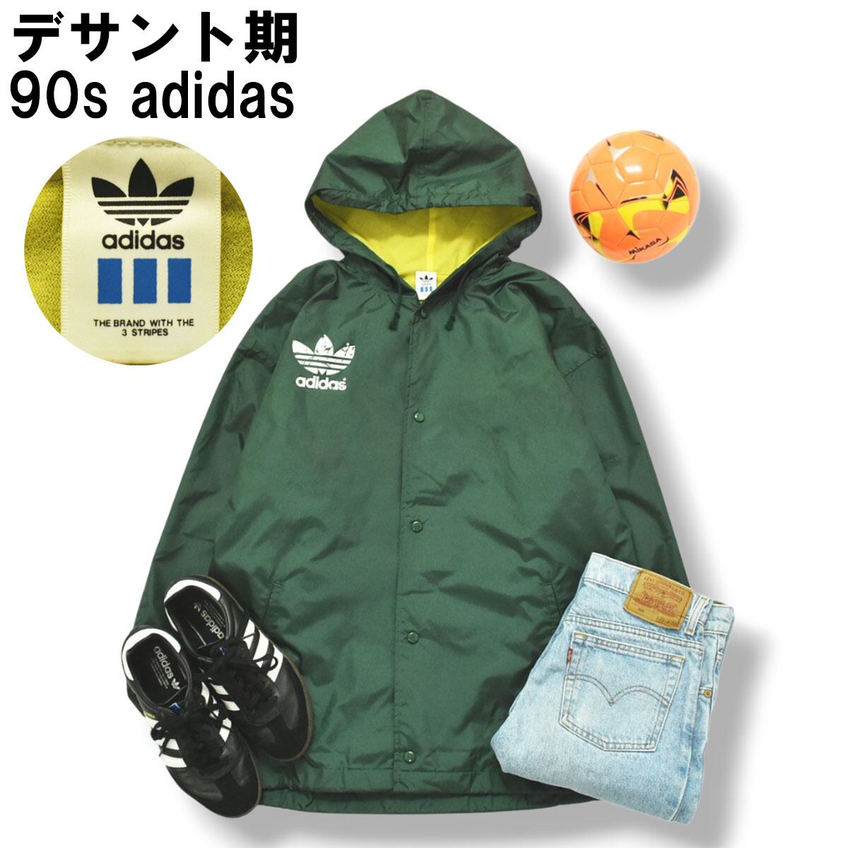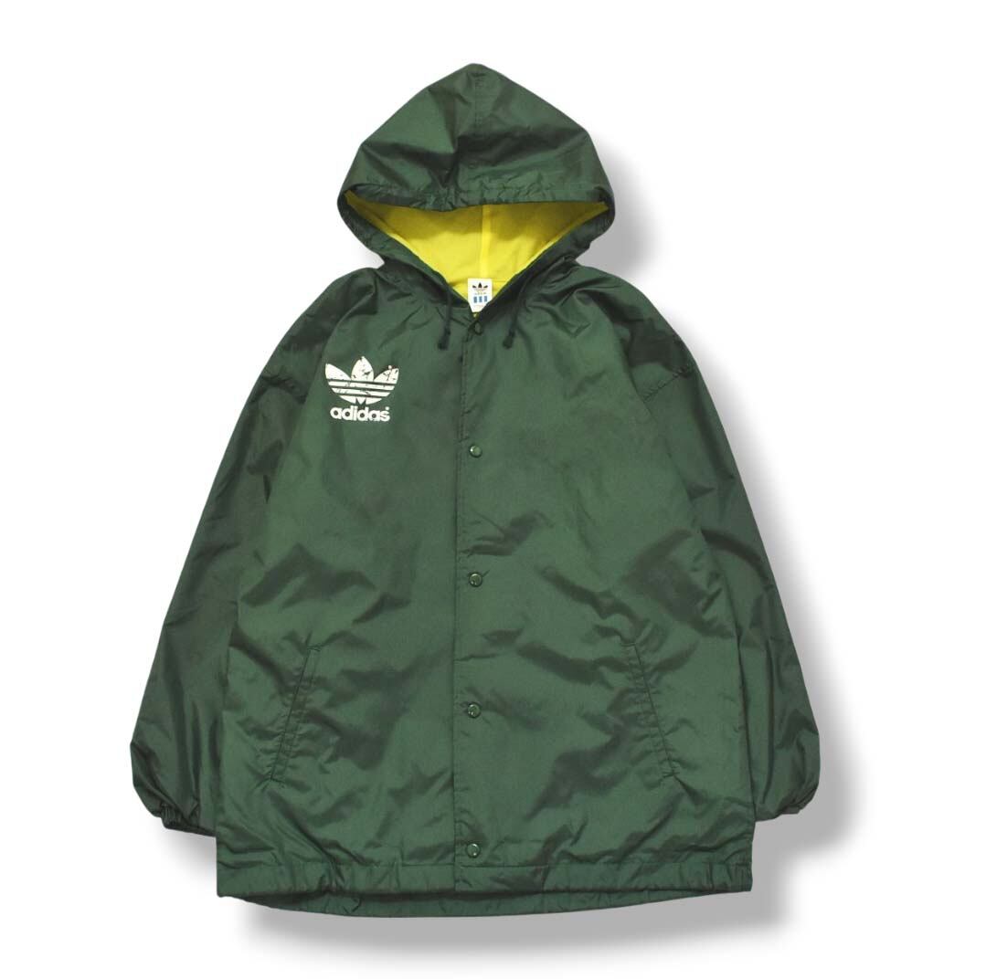 【デサント期】 90s ヴィンテージ 日本製 アディダス adidas フーデット ナイロン ジャケット トレフォイル ロゴ 裏起毛 メッシュ M−L グリーン x イエロー メンズ